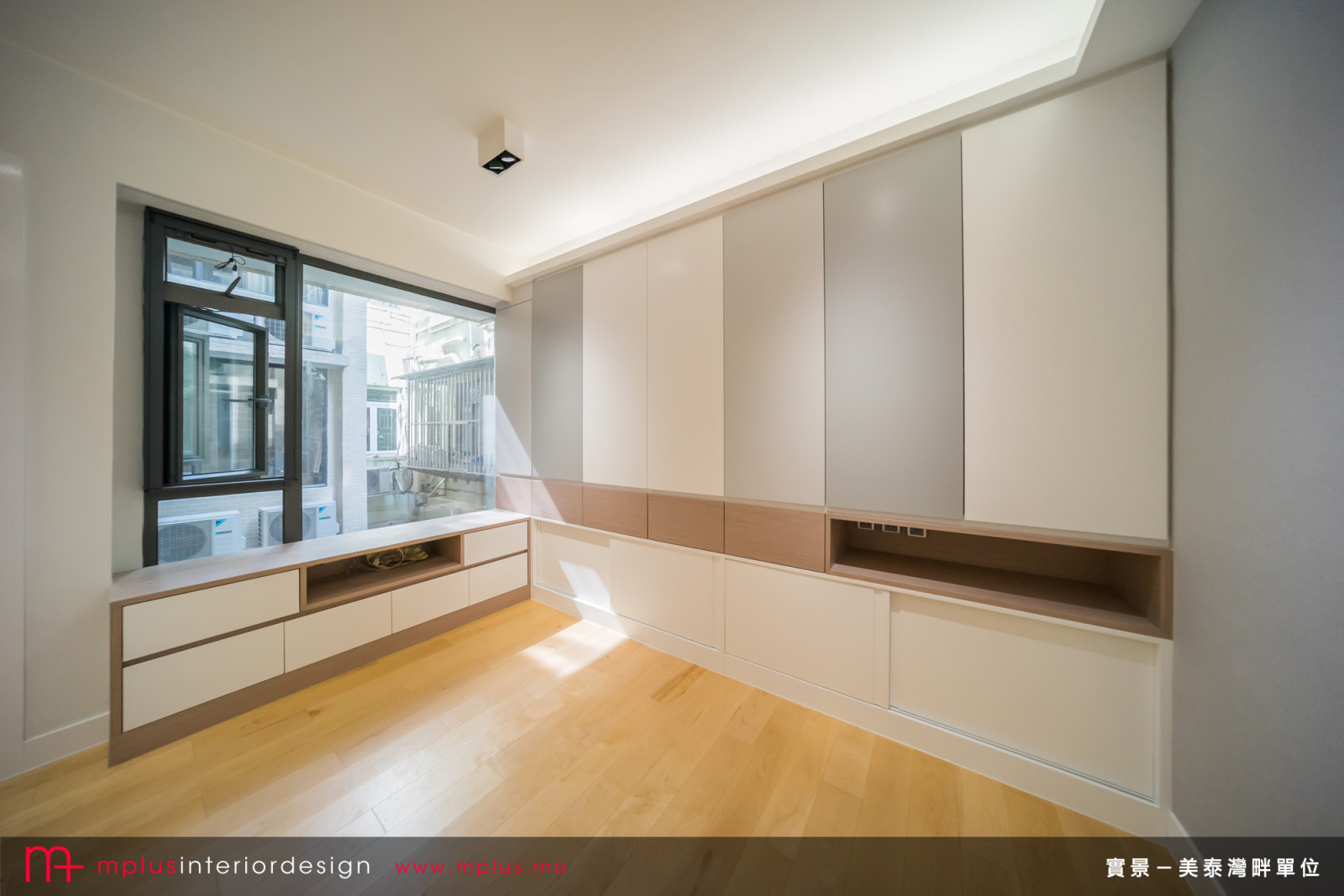 The apartment at Grand Praia is a two bedroom apartment which has a floor area of about 600 sqft. Since there is not any storage in the foyer, we have rearranged the position of a bedroom door to make space for a cabinet. There is also storage wall designed in the living room. We also designed a elevated storage platform in another bedroom to increase the storage space for the home. For the design style, white and light gray were used in the space to create a sense of space and brightness.