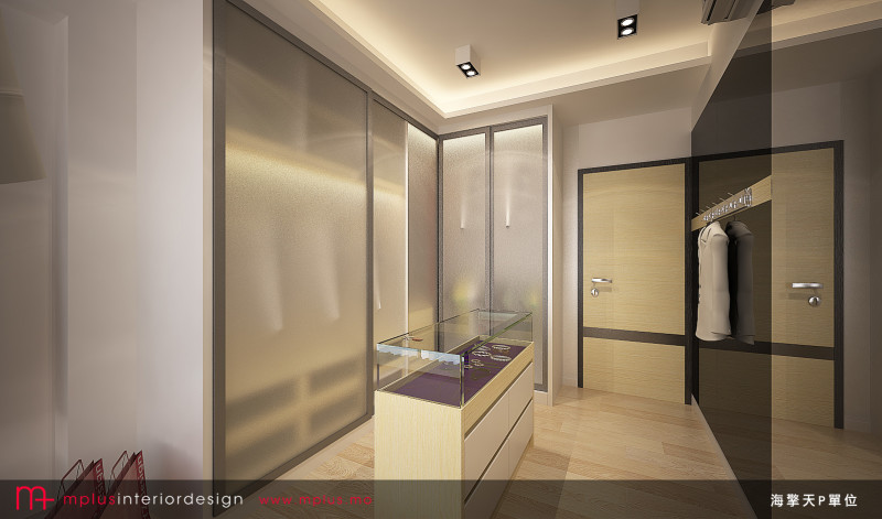 海擎天P單位為一個三房單位,實用面積約1200呎。整體設計氣氛以舒適為主。客廳使用玻璃飾櫃,增加通透感。小朋友房採用卡通森林牆紙,仿如置身童話世界之中。主人房則升高地台,且床背設計了暗門櫃,增加儲物空間。