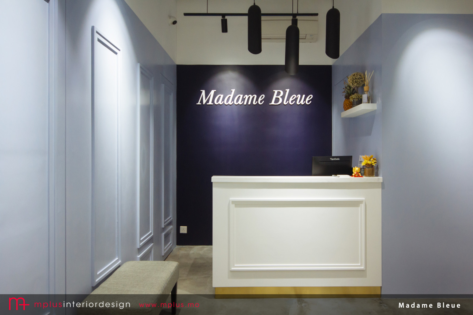 Madame Bleue 為澳門一家時裝店,店主會在世界各地採購不同的時裝,務求為客戶提供年輕、有品味、時尚、高質素但價格相宜的國際潮流衣著。設計師在設計時,利用了一些簡歐式的元素,襯色上用了藍色和灰色,營造高貴的氣氛。